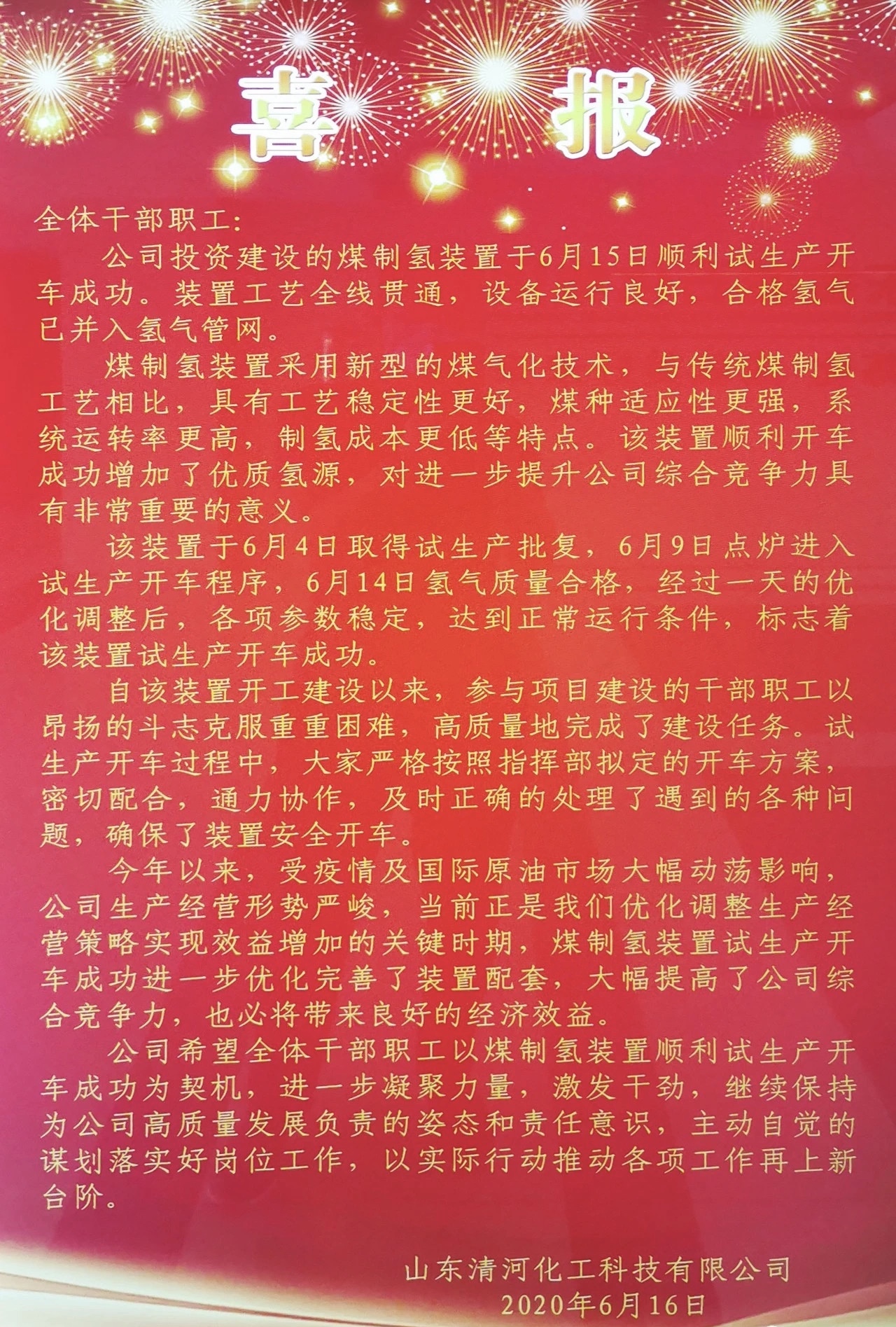熱烈祝賀山東清河化工科技有限公司60000Nm3/h煤制氫裝置一次性開(kāi)車(chē)成功